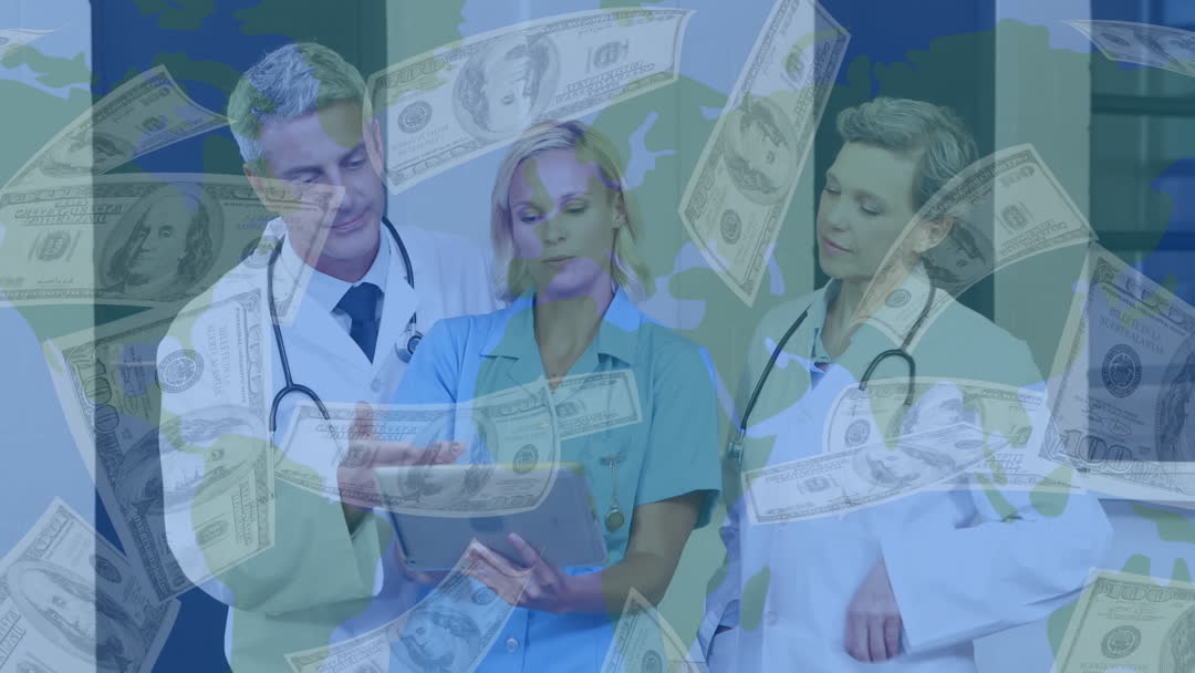 Medical professionals engaging in discussion about global healthcare finances overlayed with US dollar banknotes and world map. Ideal for illustrating topics on healthcare costs, medical economics, international price negotiations, and the impact of finances on global healthcare policies.