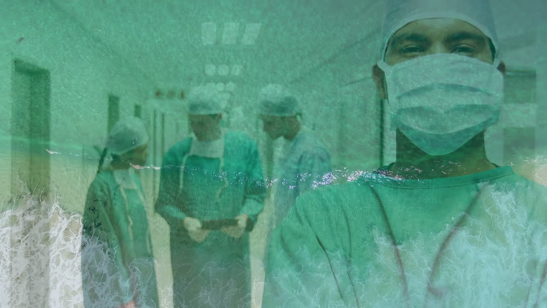 This visual features a medical team in a hospital setting with an artistic overlay of ocean waves. The symbolic integration of nature elements like the sea with medical professionals in green attire provides a visually striking metaphor for serenity within intense healthcare environments. Ideal for use in healthcare campaigns, websites exploring the intersection of health and nature, or educational projects about medical practices and teamwork.