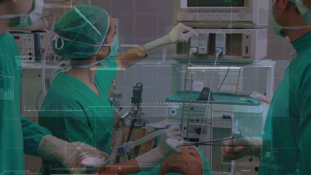 Medical professionals are seen engaging in surgery as they monitor vital healthcare data on a digital interface, showcasing the intersection of technology and medicine. This video is perfect for illustrating topics on advanced healthcare, modern medical procedures, or the integration of technology in hospital settings. Suitable for use in medical publications, educational materials, or articles focusing on digital advancements in patient care.