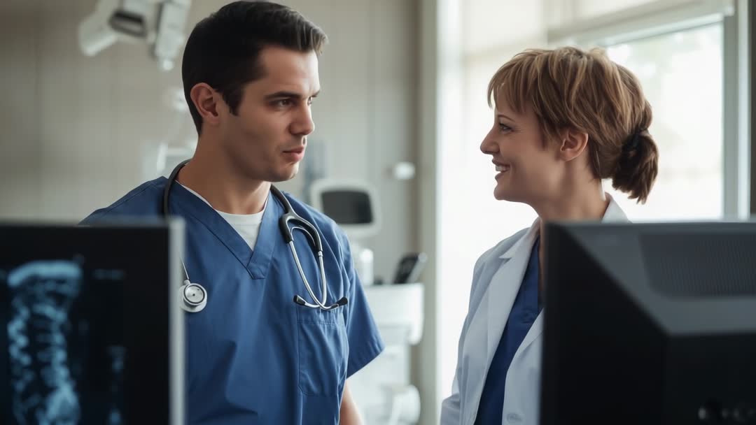 AI Generated Image. Video clip showing two clinicians reviewing spinal scan on monitor while discussing patient treatment options. Male clinician wearing blue scrubs and stethoscope, female clinician wearing lab coat, exchanging professional feedback and consulting imaging results. Framing capturing monitor foreground with spinal x-ray visible and clinicians in midground, creating sense of collaboration and clinical decision making. Lighting using natural window light for warm, realistic tone. Usage ideas: Suited for hospital websites, radiology department pages, medical training modules, case study presentations, marketing for imaging equipment and diagnostic software, telemedicine service promos, healthcare recruitment campaigns, patient education resources. Clip working well as opener for medical webinars, background footage for healthcare articles, or stock footage for doctor team profile reels. Recommend trimming to 5-15 second segments, adding subtle music and lower-third titles for branding, or overlaying graphics to highlight anatomy or findings.