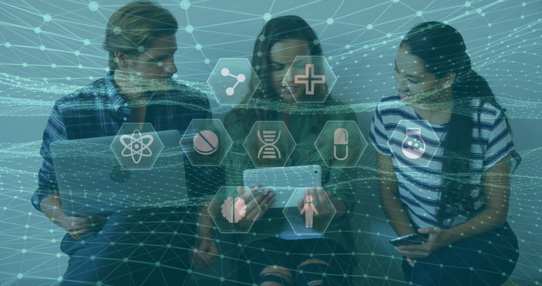Group of professionals collaborating with laptops and tablets, surrounded by digital medical icons and network connections. Shows interplay between technology and healthcare innovation. Perfect for illustrating advanced medical research, tech innovation in health sector, and global digital connectivity in presentations and articles.