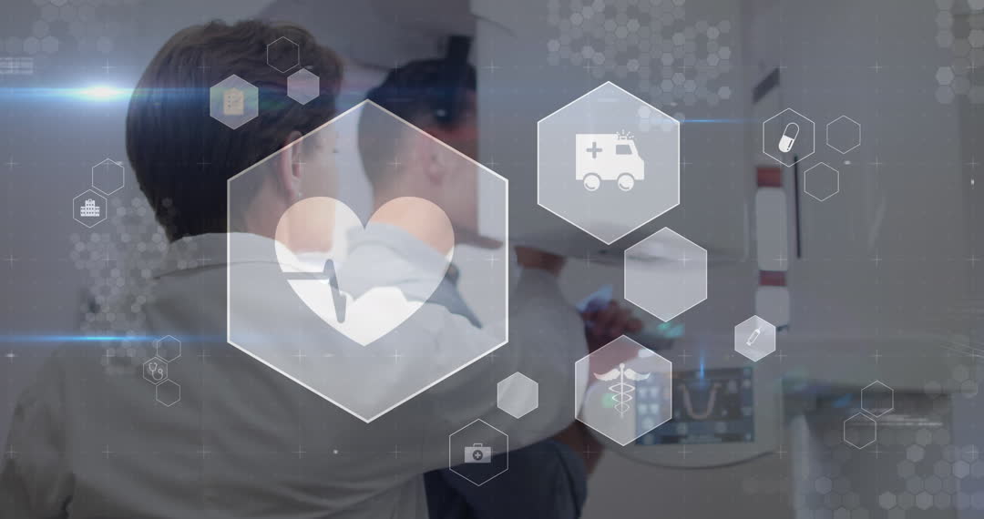 Visualization of advanced medical technology with diverse doctors engaging in healthcare procedures at a hospital. Medical icons like ambulance, heart rate, and medicine appear interactively on screen, illustrating cutting-edge medical practices. Ideal for materials on medical advancements, hospital advertising, and technology integration in healthcare settings.