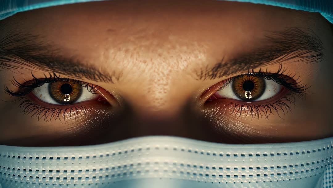 AI Generated Video. Close-up clip showing focused medical worker eyes reflecting ring light while wearing surgical mask and cap. Lighting highlighting iris detail and lashes, creating dramatic and intimate mood conveying concentration and determination. Clip fitting healthcare storytelling, PPE awareness campaigns, surgical training sequences, medical news segments, and corporate health presentations. Visual working well as video opener, thumbnail, social media clip, or background for interview lower-third. Color palette and reflections emphasizing precision and calm under pressure. Composition allowing easy overlay of text, logo, or lower-third graphics. Suitable for use in websites, brochures, patient communication, recruitment ads, and educational modules.