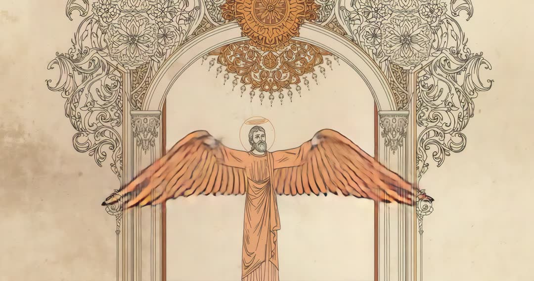 AI Generated Image. This animation showcases a bearded saint extending feathered wings within an intricately ornated archway. Illuminations surrounding the spiritual figure echo medieval art techniques, exemplary of sacred devotion from historical contexts. Lush details emphasize iconic motifs linked to holiness and serenity consumers often seek in representations of spirituality and the mystic. Suitable for enhanced engagement in cultural projects, art displays, religious publications, or vibrant backgrounds in discussions of artistry.