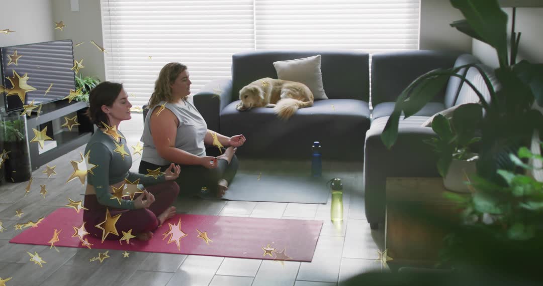 Two women practicing meditation at home, emitting a peaceful energy, complemented by playful golden star graphics. The cozy living room provides a tranquil environment, with soft natural light permeating. Perfect for promoting a sense of harmony and wellness, suitable for lifestyle blogs, wellness content, or interior design showcasing home meditation spaces.