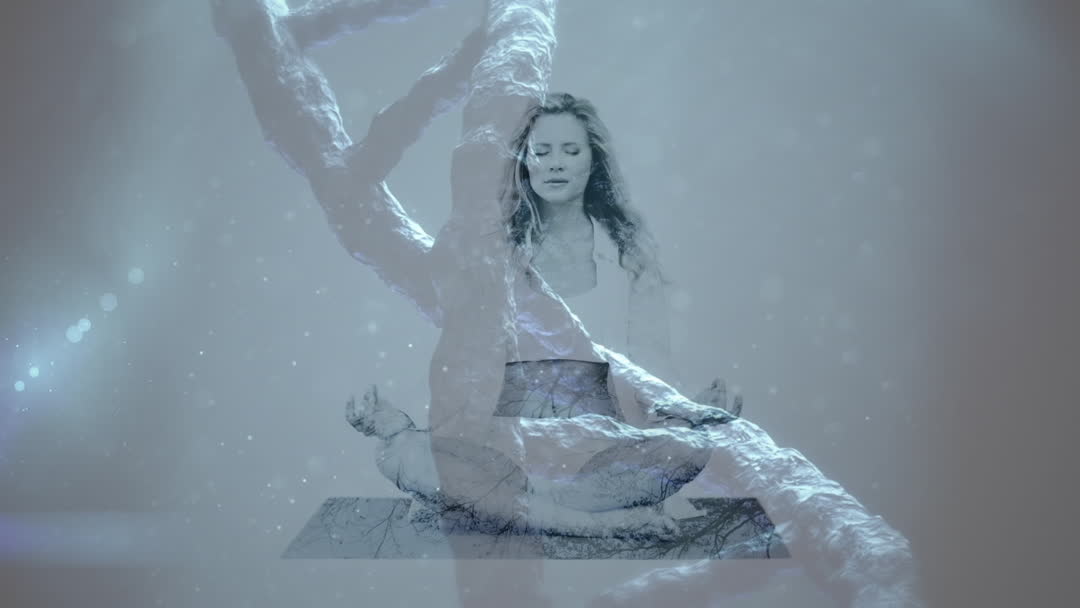 A caucasian woman sits in a calm yoga pose, her peaceful meditation captured with a transparent visual overlay of DNA and chromosomes. Blending science and art, this thought-provoking videory serves multiple media applications, health science articles on benefits of meditation for body and mind, or as innovative visuals for wellness programs and promotional materials emphasizing balance and the intersection of health and genetics.