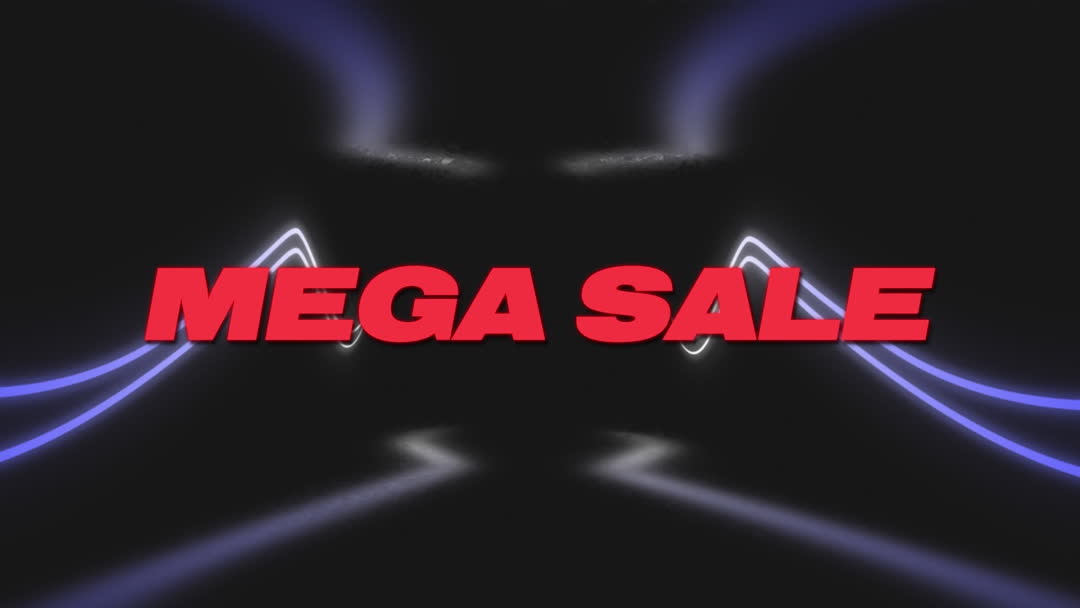 This dynamic animation features bold 'Mega Sale' text framed by moving neon light effects, perfect for drawing attention in online marketing campaigns. Ideal for use in ecommerce promotions, social media ads, or banners to capture customer interest during special sales events.