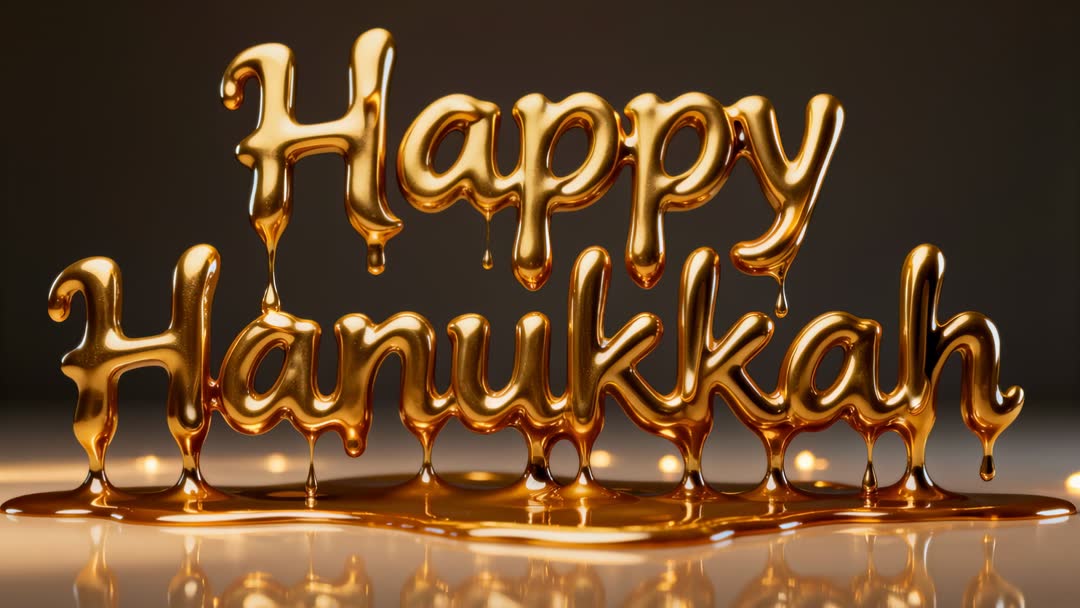 AI Generated Image. Video showing melting gold typography spelling Happy Hanukkah, dripping and pooling into glossy puddle on reflective surface under warm lighting. Close-up movement of metallic letters creating luxurious, tactile aesthetic and rich reflections. Suiting social media holiday posts, animated e-cards, website hero clips, store display loops, luxury brand promotions and seasonal marketing. Recommend pairing with slow ambient music, gentle camera push, and subtle color grade to emphasize warm tones. Clip working well as short loop, opener for commercials, background for greeting animations, or hero banner on holiday landing pages.