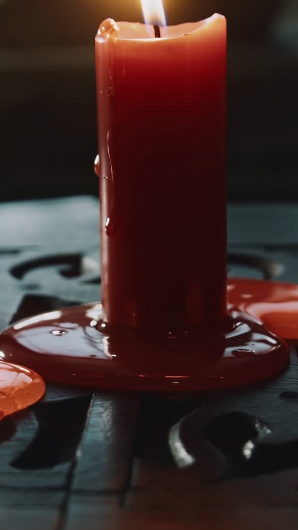 AI Generated Image. Video showing close-up of red pillar candle burning, wax melting and forming glossy pools on carved wooden surface. Flame flickering and warm glow creating moody, intimate atmosphere. Drips trailing down candle side, pooled wax reflecting light and catching highlights. Shallow depth of field isolating candle from blurred background and emphasizing texture of wax and wood. Warm orange-red color palette and low-key lighting supporting rustic, handcrafted mood. Ideal for relaxation and meditation scenes, romantic content, product background for home decor or candle brands, craft and DIY tutorial introductions, seasonal holiday campaigns, spa and wellness marketing, cinematic b-roll for mood montages, social media vertical reels and mobile ads. Source material for overlays, slow-motion cuts, looped ambient background, or as visual filler for podcasts and guided meditation videos. Recommend grading warm tones and adding soft ambient soundtrack to enhance tranquil mood. Vertical format optimized for mobile-first platforms and short-form content.