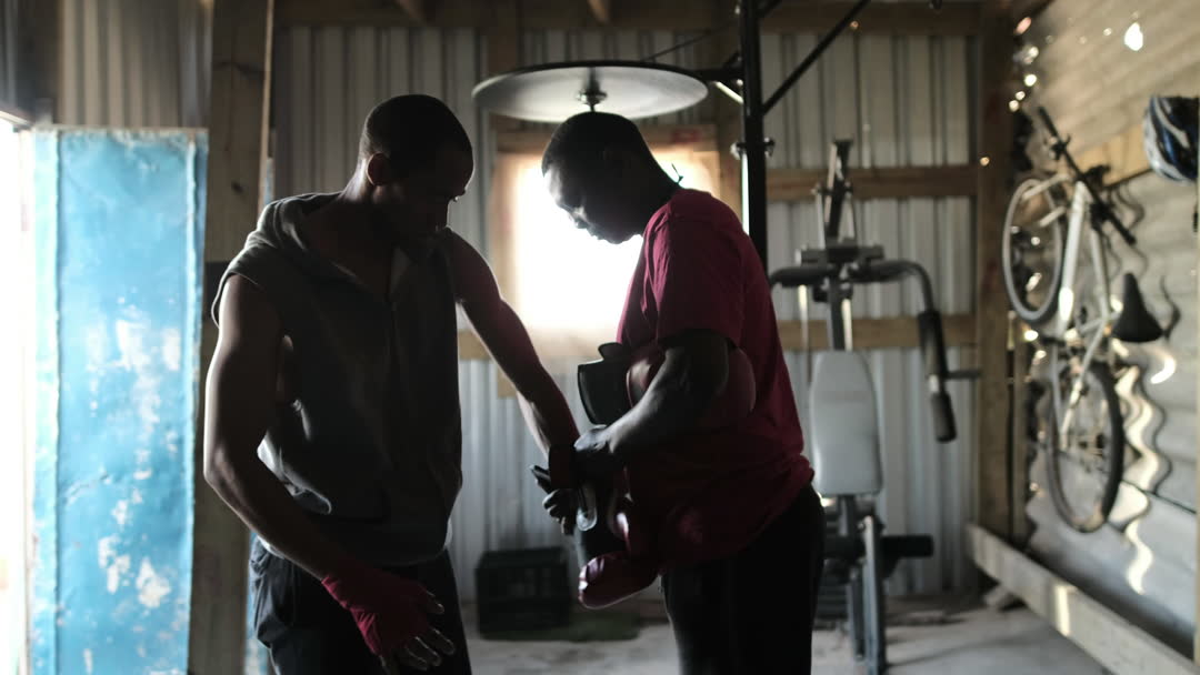 Two biracial men in sports attire engage in a pre-boxing ritual, with one assisting the other in putting on gloves. The rustic gym setting with visible equipment and natural light creates an environment of focus and discipline. This video captures the camaraderie and commitment involved in training sessions. Useful for illustrating concepts of fitness, teamwork, personal development in sports, and the isolation often found in dedicated training spaces.