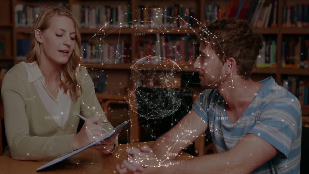 Mentor and Student Collaborating in Library with Futuristic Overlay Video