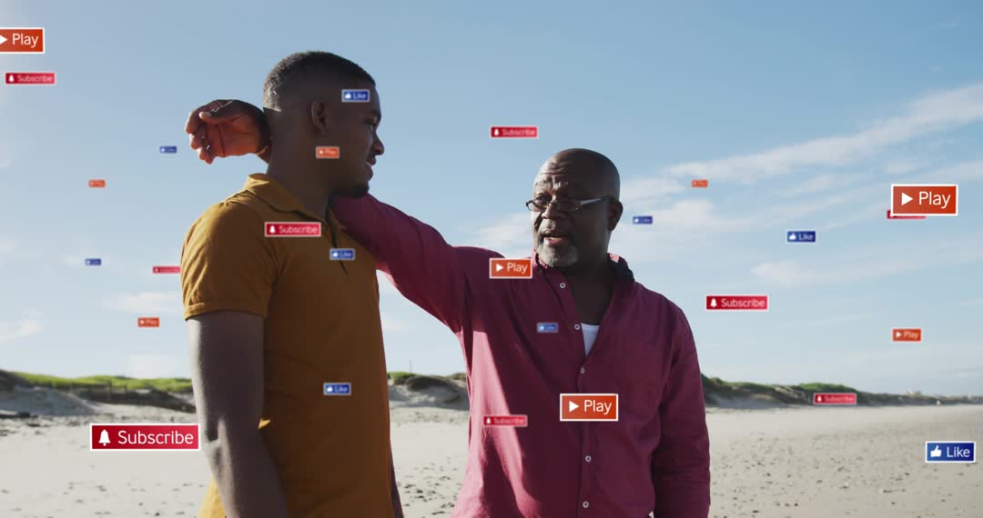 Father and son stand on a sandy beach surrounded by digital social media icons like play and subscribe buttons. This visual combines traditional mentorship with modern technology, symbolizing how timeless wisdom blends with today's digital era. Suitable for illustrating topics on family bonds, modern mentoring approaches using social media, and the exchange of life lessons across generations, particularly resonant for articles or campaigns related to parenting, lifestyle, or digital connections.