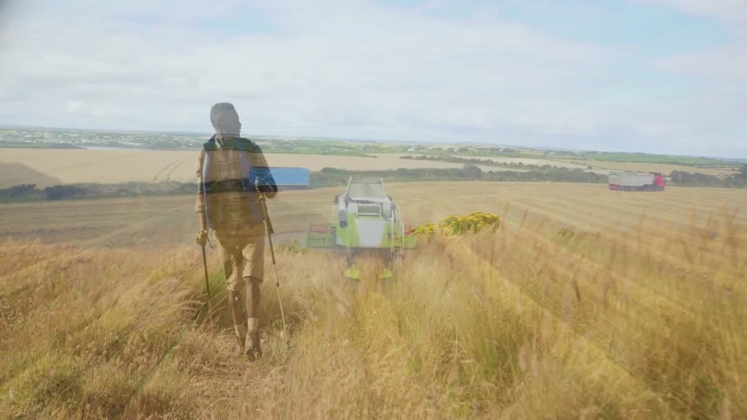 Person in pastoral field contrasted with an overlay of advanced agricultural machinery exemplifies integration of traditional methods with cutting-edge technology. Useful for concepts of technological progress in agriculture, the balance of nature and innovation, and future of sustainable farming methods. Ideal for agricultural studies, farming innovation campaigns, and rural development showcases.