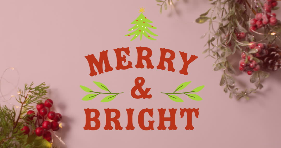 Festive video featuring 'Merry & Bright' text styled with bold red typography. Green decorative representations of a Christmas tree and leaves add a cheerful texture. Surrounded by red berries and lush foliage, creating a celebratory holiday atmosphere. Useful for Christmas cards, festive invitations, and holiday promotional materials.