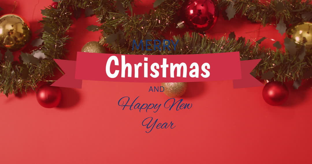 Festive Christmas and New Year greeting with decorative elements including garland and ornaments against a vibrant red background. Ideal for holiday cards, invitations, and social media posts.