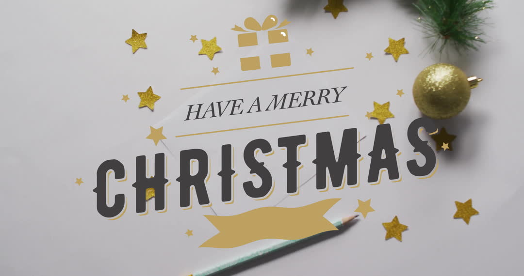Animated greeting for Christmas with overlay text saying 'Have a Merry Christmas' among golden stars and fir branches on a white background. Ideal for creating holiday greeting cards, social media posts, digital banners, and festive invitations.