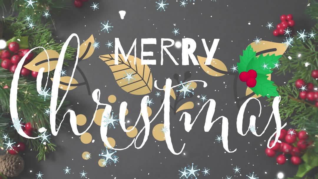 Perfect for holiday greetings and Christmas email cards, this festive visual shows animated Merry Christmas text alongside classic holiday decorations like holly, snowflakes, and greenery. Use this to add a joyous touch to social media posts or present as a cheerful digital backdrop during virtual events.