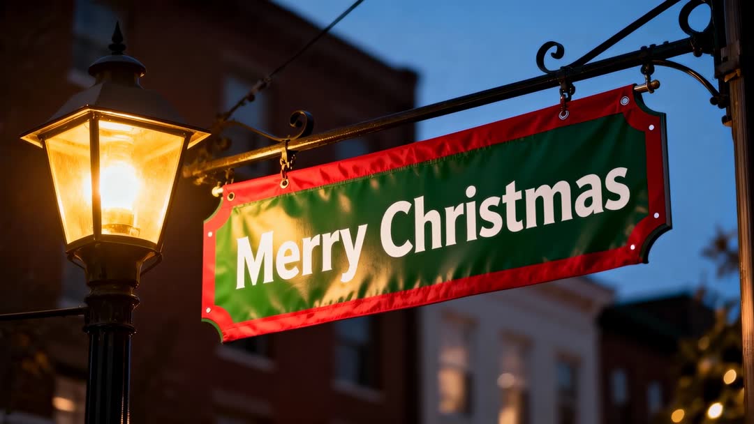 AI Generated Video. Featuring green and red Merry Christmas banner hanging from ornate metal bracket beside glowing street lantern at dusk, banner fluttering in breeze, lantern casting warm light and blurred storefront windows creating cozy urban holiday atmosphere. Clip capturing close-up of festive signage and vintage lamp while twilight blue sky provides contrast, evoking nostalgic small town holiday charm. Ideal for holiday marketing, seasonal social media posts, retail storefront promos, website hero video, greeting card animation, TV commercial opener. Useful as looping background for title overlays, lower thirds, product showcase, or seasonal event announcement. Best paired with warm color grading, subtle slow motion, and text overlay on right side for easy branding and headline placement.