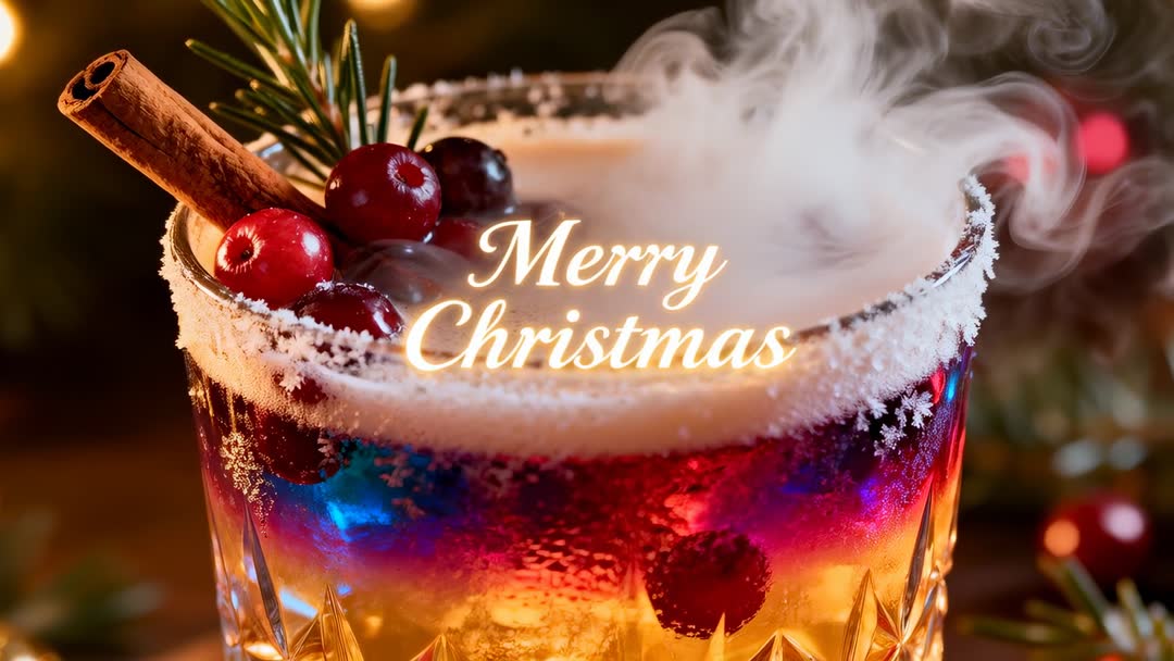 AI Generated Video. Showing close-up of sugared-rim Christmas cocktail with cranberries, cinnamon stick, rosemary sprig, and swirling dry ice vapor. Featuring glowing "Merry Christmas" text overlay and colorful backlight creating blue, red, and golden reflections. Creating frosty holiday mood with cinematic steam and bokeh lights. Working well for holiday marketing, restaurant and bar menus, cocktail recipe video intros, social media posts, greeting card animations, event invitations, and seasonal e-commerce banners. Providing clear negative space for additional text or logo on upper-right area. Serving as loopable background for party promos or festive title sequences. Delivering high-impact visual for winter celebration campaigns and mixology showcases.