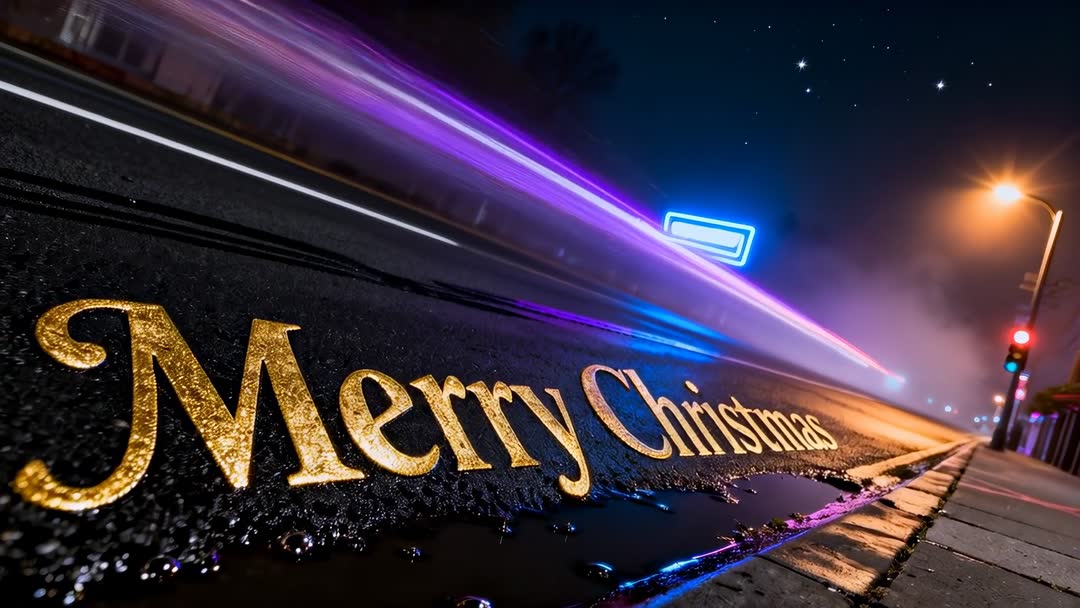 AI Generated Video. Golden Merry Christmas lettering glittering on wet curb while neon light trails streaking across night sky, creating cinematic motion blur and festive glow. Wet pavement reflecting vibrant neon purples and electric blues along with warm amber streetlight highlights, puddles amplifying shimmering textures. Low-angle curb-level perspective emphasizing typography and urban depth, long exposure technique capturing dynamic traffic motion and light streaks. Enhancing holiday marketing visuals by adding luxe seasonal vibe, perfect for social media reels, retail window displays, festive event promos, website hero backgrounds, digital greeting animations, and outdoor advertising mockups. Mood conveying moody cinematic nighttime atmosphere suitable for luxury brands, nightlife venues, retail campaigns, and cinematic title sequences. Color palette featuring rich gold, neon purple, electric blue, and warm amber for striking seasonal contrast.