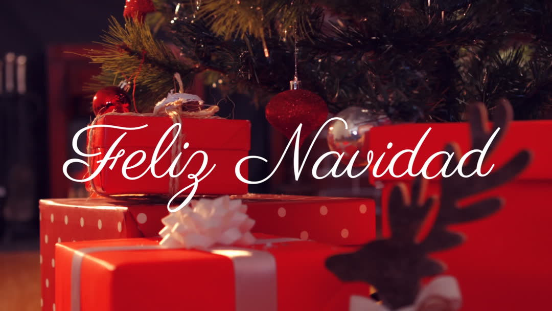 Depicts warmly wrapped Christmas gifts under a Christmas tree with ornaments and a Feliz Navidad greeting. Used for festive greeting cards, holiday announcements, social media posts celebrating the Christmas season.