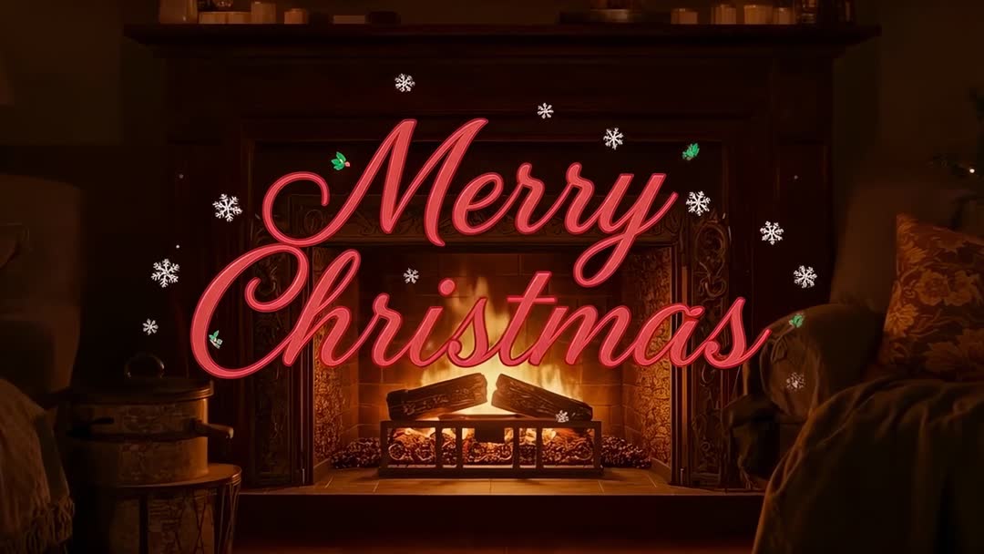 AI Generated Video. Video showing Merry Christmas script overlay appearing over ornate mantel with warm flickering fire, cozy armchairs, holiday gift boxes, falling snowflakes and holly accents. Scene creating inviting holiday mood with soft amber lighting and gentle motion, ideal for short greeting loops and seasonal clips. Useful for social media posts, email headers, website hero banners, digital signage, in-store displays, seasonal ads, livestream overlays and virtual event backgrounds. Color palette featuring warm oranges, deep browns, festive red text and green accents for classic holiday look. Editable overlay style allowing text replacement and timing adjustments for custom greetings or branding. Recommended delivery as looped MP4 or animated GIF for use on Instagram, Facebook, YouTube intros, email campaigns and retail screens.