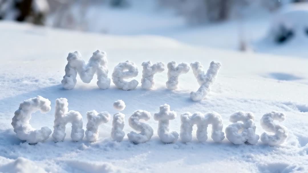 AI Generated Video. Video clip showing Merry Christmas spelling out in three-dimensional snow letters resting on sunlit winter slope with gentle snowflakes falling. Soft natural light and shallow depth of field creating serene mood and crisp texture on snow typography. Ideal for holiday greeting videos, seasonal social media posts, e-card backgrounds, winter commercials, and store window display loops. Useful for creating animated intros, title cards, seasonal overlays, and website hero banners; offering easy compositing for adding animated snowfall, color grading, logo reveal, or custom text overlays. Suitable for converting to stills for magazine spreads, promotional banners, and seasonal advertising.