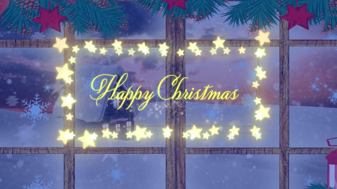 Festive text 'Happy Christmas' displayed over glowing fairy lights in star shapes on wooden window frame. Snowflakes and outdoor snowy landscape visible. Ideal for Christmas cards, holiday announcements, or festive decor suggestions.