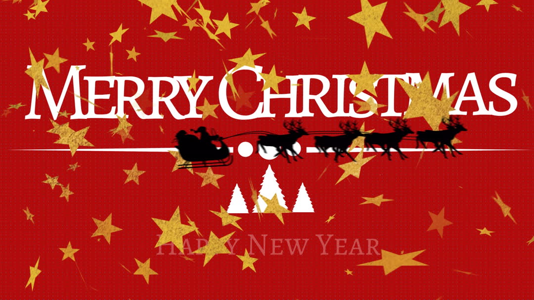 Colorful Christmas greeting featuring falling yellow stars against a red background with 'Merry Christmas' text. Silhouette of Santa's sleigh pulled by reindeers enhances festive vibe. Ideal for holiday cards, seasonal promotions, invitations, and family newsletters.