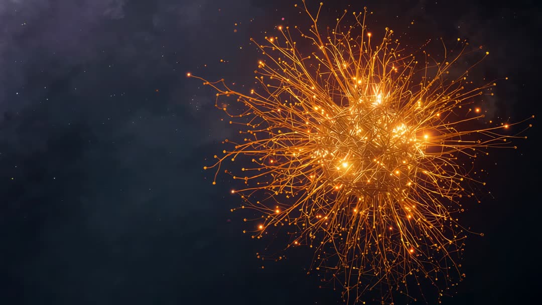 AI Generated Image. An abstract video art piece showcasing a radiant, golden core emanating filament-like sparks in a cosmic, nebulous void. Each filament seems to independence its own glow, hinting at connected celestial energies. Rich with vibrant visual complexity, it forms a pseudo-supernova display resonating themes of cosmic creation and mysterious energies. Perfect for futuristic, science-related projects, covers, presentations about spacetime phenomena, or as immersive backgrounds for events and displays.