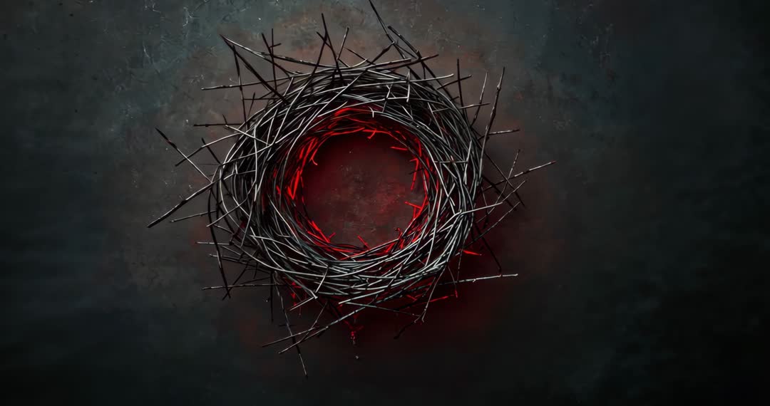 AI Generated Image. Video inspired by nature and innovation, featuring nest-like structure with a vivid pulsing red core on textured dark surface, creating a mystical ambiance. Suitable for visual media projects exploring themes of nature, technology, mystery, animation or mood setting backdrops. Ideal for content and projects aiming to merge organic and digital themes.