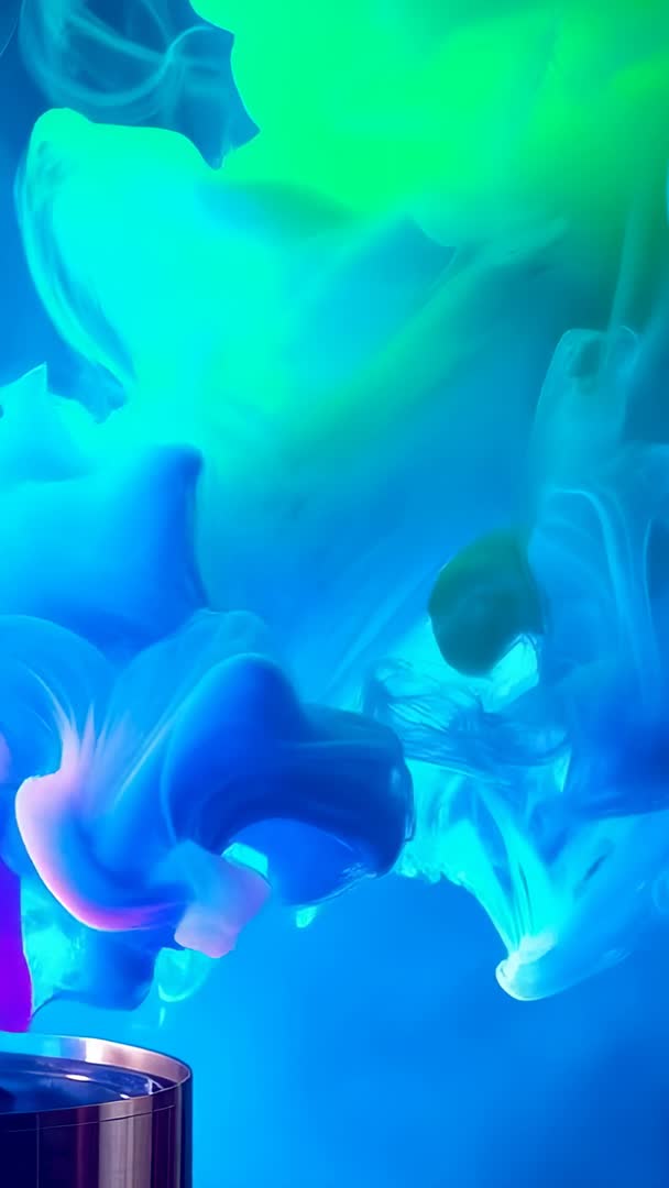 AI Generated Video. Video showing metal cup injecting neon inks into tank, creating ethereal flowing plumes of blue and green. Backlit translucent pigments combining into swirling gradients and soft edges, offering striking vertical composition optimized for smartphone screens. Featuring cyan, teal, electric blue, lime green, and soft magenta accents with high-contrast layers and smooth organic motion. Serving as mobile wallpaper, social media story background, ad creative, product promo, motion graphics overlay, and website hero. Clip working well for looping backgrounds and transitions in music videos, brand spots, and app intros. Also fitting for educational content exploring fluid dynamics, pigment mixing, and experimental art.
