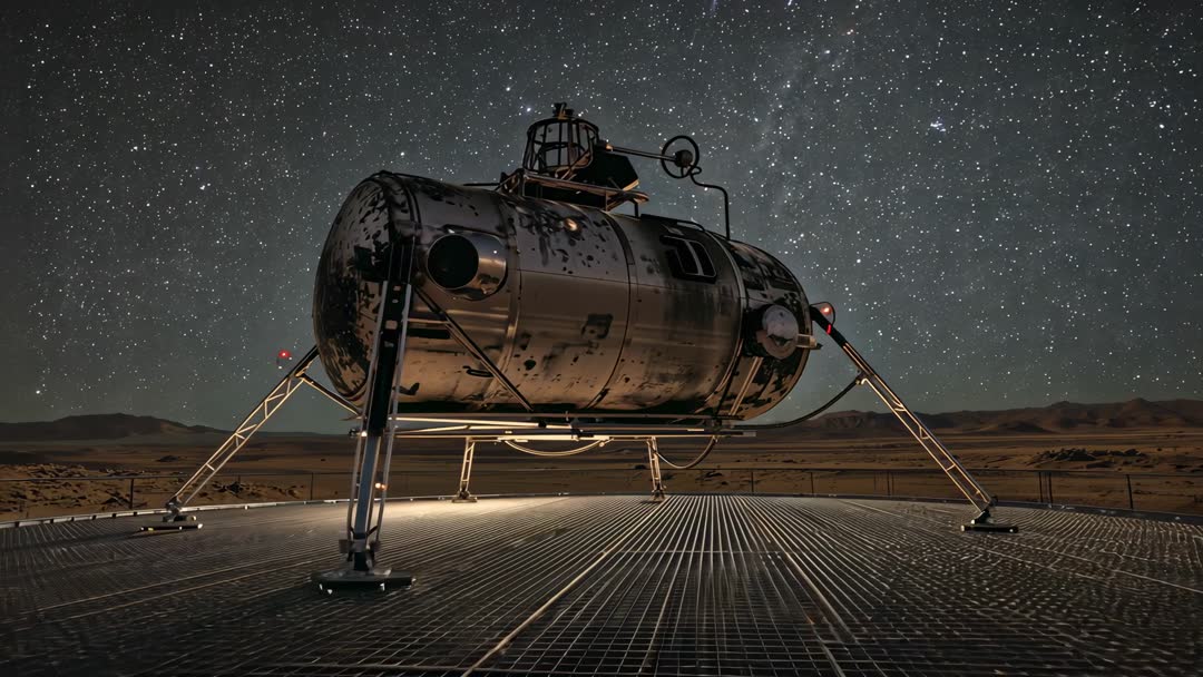 AI Generated Video. Video showing metallic cylindrical lander approaching grated pad under Milky Way backdrop. Panning camera bringing vessel closer, revealing turret, external piping, weathered hull and articulated landing legs catching low-angle rim light. Starfield and distant desert dunes composing expansive starlit horizon and adding scale. High-contrast cinematic lighting emphasizing texture and industrial detail. Use cases include supporting sci-fi trailer sequences, demonstrating prototype concept for aerospace presentations, enhancing website hero banners for space technology brands, creating museum exhibit loops or planetarium visuals, serving as background for editorial features on exploration and engineering, and producing social media teasers or video ads. Footage lending dramatic mood for storytelling, concept development, pitch decks, and educational content on planetary landing mechanics.