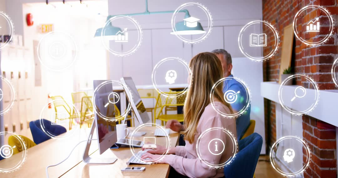 A mid adult professional woman types at a desk beside a coworker who is pointing at the screen. Transparent icons representing technology analytics when activated appear above the workstations, suggesting a tech-focused and collaborative environment. Useful for highlighting modern workplace dynamics, collaboration in professional settings, and the role of data and technology in business operations. Ideal for presentations about workplace education, digital transformations, or productivity tools.