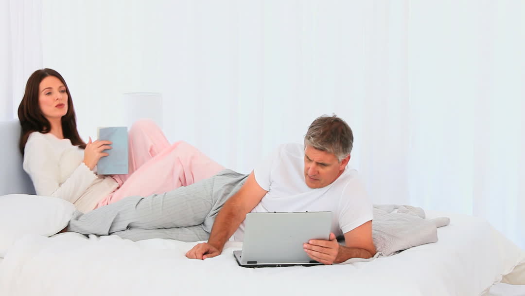 - Middle-aged Couple Relaxing with Laptop in Bed at Home