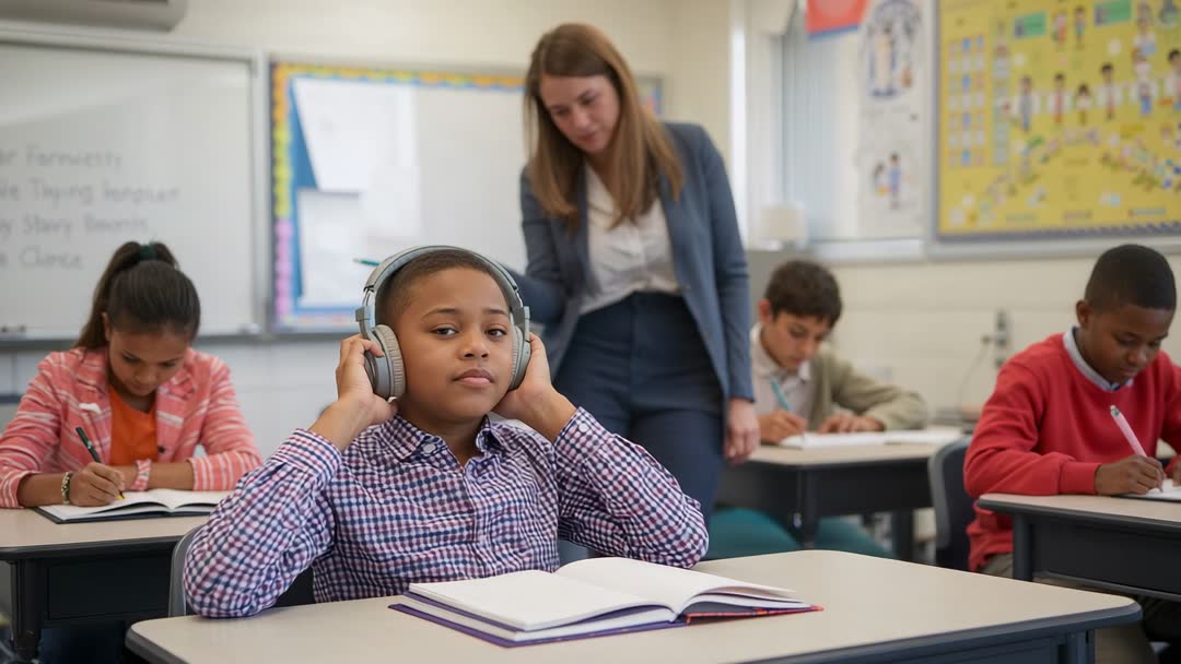 AI Generated Image. Video showing middle school student adjusting over-ear headphones while teacher checking classwork and classmates writing at desks. Framing focusing on student at front desk with open notebook, conveying concentration, listening-based learning, and calm classroom atmosphere. Background featuring teacher leaning to review work, adding sense of supervision and support. Lighting natural with warm tones, suitable for close-up and medium shots and adaptable for cropping to horizontal or square formats. Use for illustrating classroom focus, blended learning, and edtech demonstrations; ideal for educational website banners, e-learning product campaigns, teacher training presentations, classroom management articles, back-to-school marketing, blog posts about listening skills and student engagement, product ads for headphones or learning tools, social media posts, and newsletters. Pair with headlines about focus, inclusive instruction, adaptive learning, or audio-supported study; leave room for lower-third text or logo overlay.