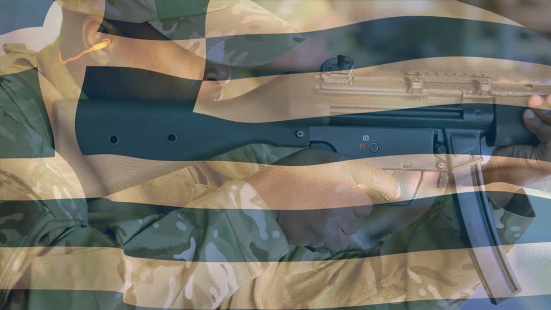 Illustrates military collaboration through montage of Greek and English flags over soldiers. Represents international alliances and training efforts between forces. Use for topics like global military cooperation, diversity in the armed forces, international defense agreements.