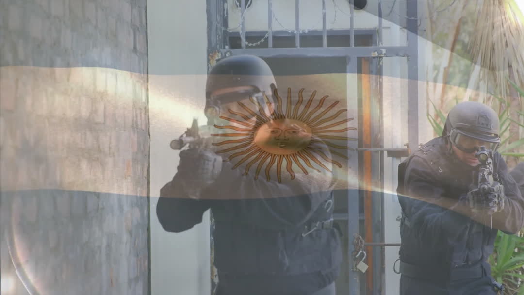 Image depicts soldiers engaged in a military operation with the flag of Argentina superimposed. Soldiers wearing tactical gear, with emphasis on patriotism and military service. Useful for concepts related to defense, security, and national pride.