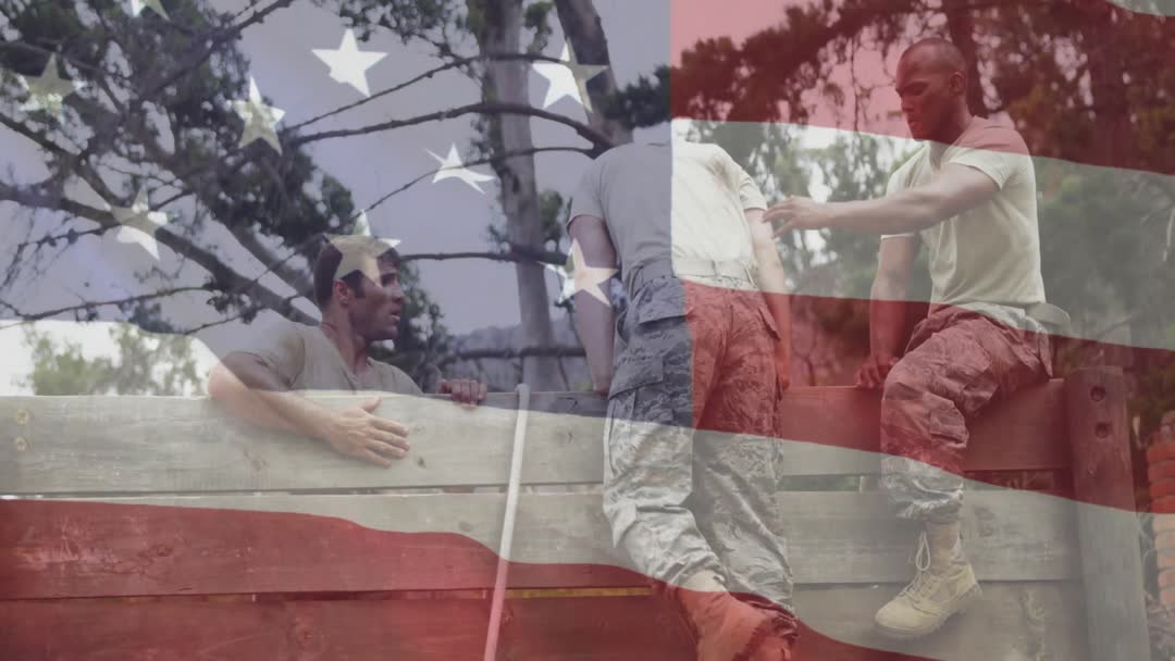 Servicemen actively participating in an outdoor training session, taking turns to climb together using ropes while offering support and encouragement. This festive and patriotic representation, blended with the U.S. Flag overlay, perfectly captures the spirit of camaraderie, resilience, and determination of those serving. Ideal for military service websites, community workshops focused on teamwork, inspiration for resilience programs, or publicity materials showcasing patriotism and unity.