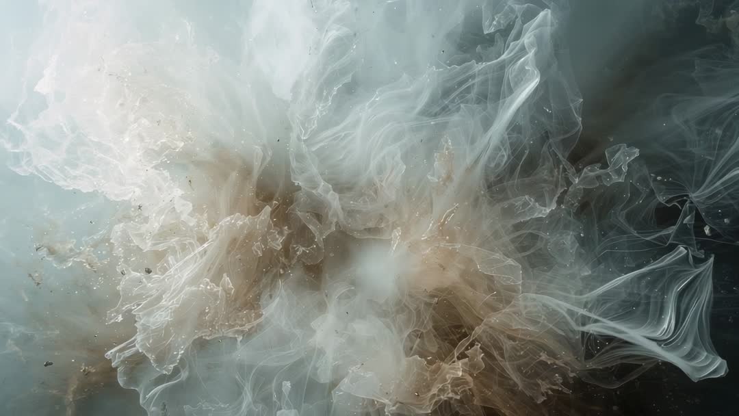 AI Generated Image. Milky-beige plume diffusing through clear liquid, unfurling translucent filaments and scattering fine suspended particles. Working well as moody background for websites, video intros, music visuals, brand campaigns, social media content. Enhancing packaging design for cosmetics and perfume, adding luxury texture to editorial spreads and product advertising. Serving as abstract visualization for scientific concepts such as diffusion, fluid dynamics, particulate suspension, and chemical reaction demos. Providing cinematic overlay for title sequences, transitions, promotional reels, and ambient video loops. Recommending export as 4K slow-motion clip and creating seamless loop for motion graphics, or isolating color channels for graphic textures and print backgrounds.