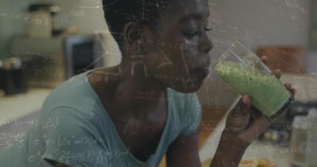 Image depicts an individual drinking nutrient-rich green juice while mathematical equations overlay. This blend of concepts visualizes the connection between health and intelligence, useful for educational or wellness-focused content.