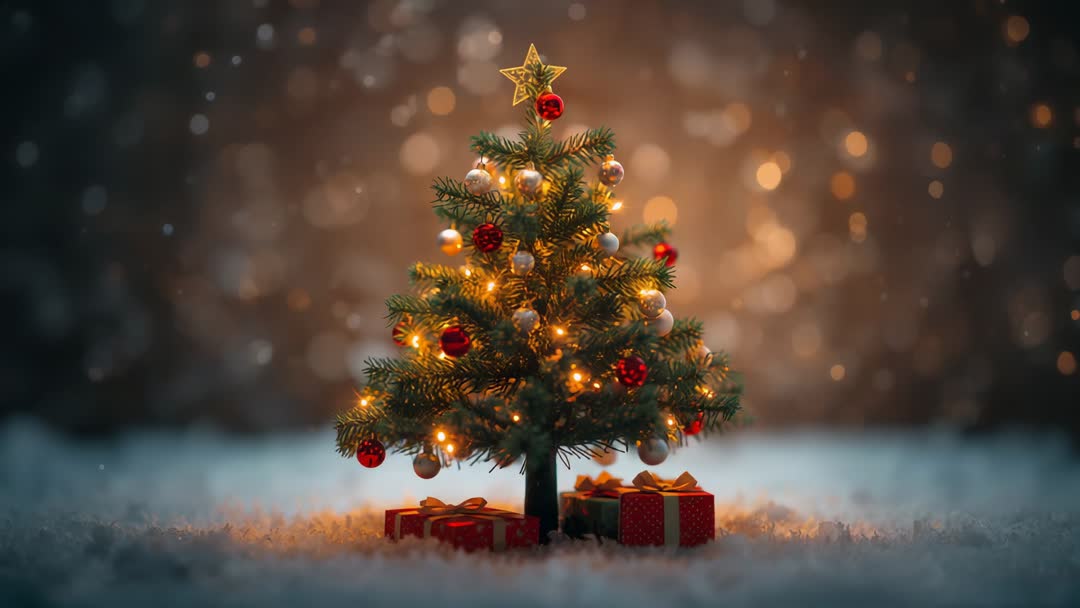 AI Generated Video. Showing miniature Christmas tree twinkling with warm string lights, snow gently falling, wrapped gifts resting beneath branches. Evoking cozy, calm, festive mood with warm gold and red highlights and soft bokeh background. Working well for social media posts, website banners, seasonal ads, greeting card animations, holiday email headers, retail promos, video intros, background loops for virtual meetings. Allowing overlay of text or logo at upper left or right, offering easy color grading for warmer tones, supporting seamless looping for ambient holiday background. Suggesting pairing with soft instrumental bells or piano for gentle soundtrack. Ideal for holiday marketing, e-commerce banners, seasonal blog headers, greeting card animations, and festive product showcases.
