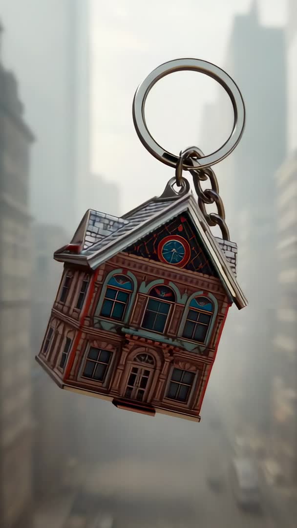 AI Generated Video. Vertical video showing close-up of rotating metal key ring with ornate miniature Victorian house charm hanging over blurred city street. Camera focusing on detailed facade, colored enamel accents, tiny windows and roof tiles while background fading into soft bokeh. Scene conveying themes of homeownership, real estate, moving, travel souvenir, gift and urban living. Video offering loopable rotation and shallow depth of field that leaves ample negative space for headline or logo overlay. Usage ideas: - Real estate ads and social media reels promoting first-time buyer stories, open house events, or mortgage services - Lifestyle blogs and articles about moving tips, homeownership guides, neighborhood discovery - E-commerce listings and product pages for keychain, souvenir or jewelry shops highlighting craftsmanship and detail - Travel and tourism campaigns featuring keepsake or city souvenir merchandising - Greeting cards, gift guides, promotional banners for housewarming, new home gifts or realtor branding Technical notes: - Vertical orientation ideal for Reels, TikTok, Instagram Stories and mobile ads - Close-up macro framing creating strong focal point and easy text placement in background - Neutral blurred city background allowing color grading, headline overlay and logo placement