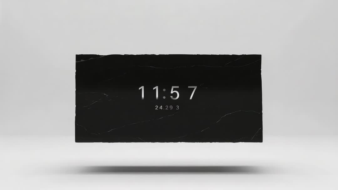 AI Generated Image. Single-frame video showing minimalist black marble slab hovering in neutral studio while digital clock readout updating to 11:57. High-contrast monochrome composition combining textured slab edges, soft shadow, and centered numeric typography for dramatic floating effect. Suited for tech website hero, app splash screen, UI concept presentation, motion graphics opener, broadcast countdown, product promo, or social media campaign. Background offering ample copy space for logo or messaging overlays and for adding animated transitions or color accents. Downloadable frame working well as mockup for UI prototypes, motion design experiments, countdown sequences, brand identity reels.