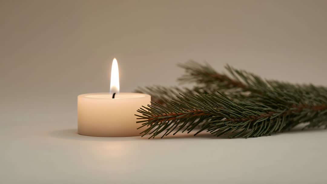 AI Generated Image. Slow-moving clip focusing on small white candle burning steadily on neutral beige tabletop, with evergreen pine sprig resting beside candle. Soft warm light casting gentle reflection on surface, creating calm intimate mood. Minimal composition emphasizing texture of pine needles and smooth wax, with shallow depth of field keeping background softly blurred. Serving holiday, winter, relaxation, meditation, and home decor projects. Working well for seasonal social media posts, background footage for commercials, calming intros for wellness videos, greeting card animations, website banners, and product displays. Providing loop-friendly short clip for overlays during holiday promotions or candle brand showcases. Color palette offering warm creams and deep greens, making easy pairing with elegant typography and minimal graphics.