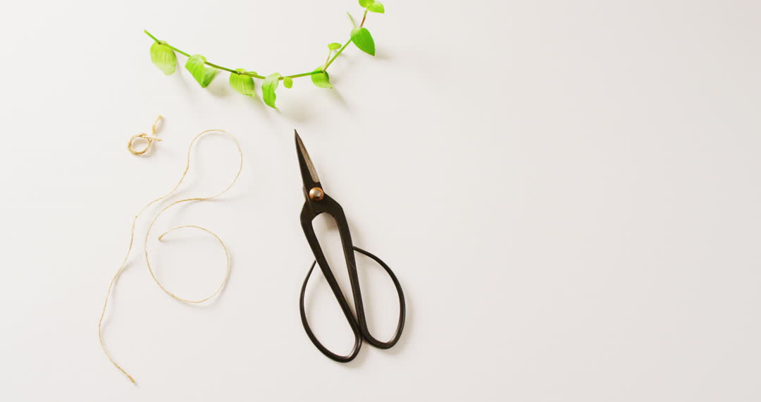 This stock provides a clean, minimalist arrangement of gardening scissors, a plant cutting with leaves, and a string on a white background, emphasizing the simplicity and eco-friendliness of home horticulture. Useful for gardening blog posts, eco-friendly or minimalist lifestyle videory, tutorial articles, and hobbyist content focused on crafting or plant care projects. Offers an inviting and straightforward look for ideas centered around home gardening and DIY influences.