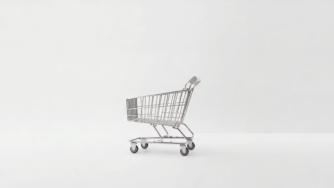AI Generated Image. Footage showing empty chrome shopping cart rolling slowly across white studio background. High-key lighting creating clean negative space and soft shadow under cart. Composition centering cart with ample copy space for text and graphics. Loop-friendly clip delivering smooth wheel motion and consistent exposure across frames. Fitting retail and ecommerce campaigns, store promotions, product placement, advertising banners, social media ads, website hero reels, presentation slides, educational content about consumer behavior. Suggested uses: overlaying brand logo, animating product inserts inside cart, adding price or call-to-action text, creating looping banner for web. Editing tips: cropping to widescreen, applying slow motion for dramatic effect, adding color grade to match brand palette, inserting subtle camera push for depth. Clip working well for minimalist design projects and corporate marketing materials.