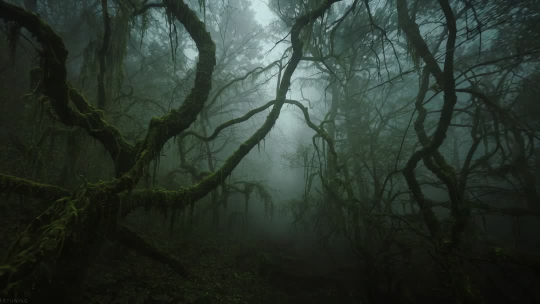- Misty Atmospheric Forest with Moss-Covered Trees in Foggy Wilderness