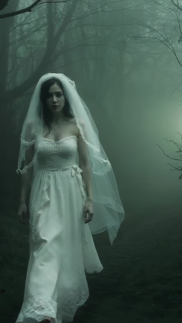 - Misty Forest Bride Walking Along Foggy Path Veil Flowing Haunting Vertical Video