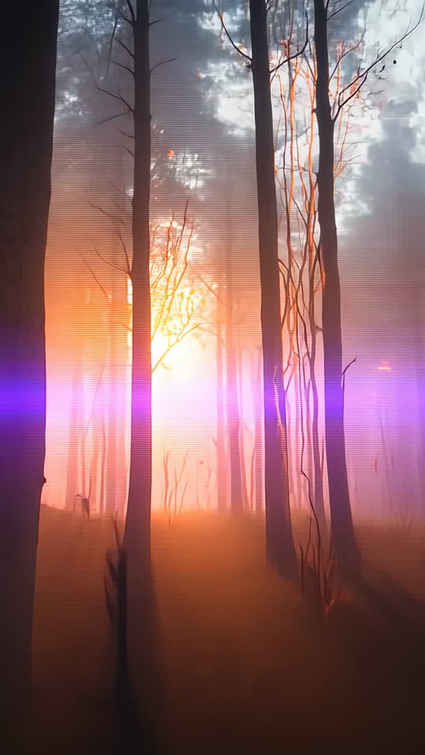 AI Generated Image. Vertical video showing misty forest at sunrise, low sun bathing tall tree trunks and forming purple lens flare and shafts of light through haze. Composition featuring strong backlight, deep silhouettes, warm orange glow contrasted with cool violet band across frame, creating cinematic and ethereal atmosphere. Offering vertical 9:16 aspect ratio and slow-motion feel, suitable for looping and seamless edits. Suggested uses include background for meditation and relaxation apps, cinematic openers and title sequences, social media reels and vertical ads, atmospheric b-roll for nature documentaries, environmental campaign visuals, mobile wallpapers and ambient streaming loops. Editing tips include applying subtle color grading to emphasize warm-to-cool contrast, adding gentle camera pan or parallax to increase depth, and pairing with soft ambient audio for immersive mood building.